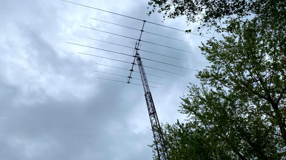 Für KW stehen ein Opti Beam OB 9-5 (14-30MHz) sowie ein 80m langer Langdraht im Einsatz. Ad hoc können diverse Drahtantennen gespannt